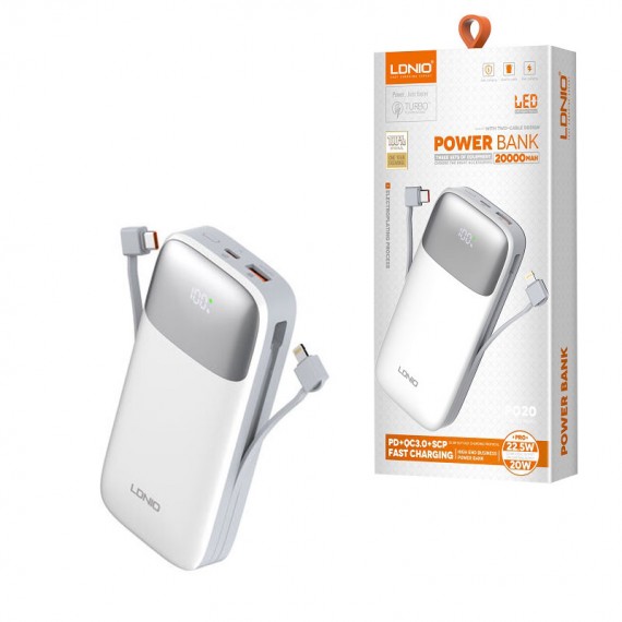 پاوربانک الدینیو PQ20 جدیدترین پاوربانک کمپانی LDNIO و یکی از زیباترین ، خوش ساخت ترین و مجهزترین مدل ها این برند محصوب می گردد. طراحی شکل ظاهری به شدت جذاب و چشم و نواز است. متریال بی نظیر ، کیفیت ساخت بالا ، خوش دست بودن و ظاهر حرفه ای این محصول ، از دیگر مزایای این کالا در نگاه اول است. به بدنه ، 2 نوع کابل متصل است ، تا کاربر را از به همراه داشتن کابل های متعدد بی نیاز سازد. در بالای پاوربانک 1 درگاه ورودی Type-C قرار گرفته که می تواند پاوربان را بصورت FAST شارژ نماید. در کنار آن 1 درگاه خروجی USB نیز تعبیه شده است. بر روی پنل جلویی ، نمایشگر LCD برای نماش درصدی شارژ باقی مانده در پاوربانک قرار دارد که به زیبایی و جذابین این محصول نیز ، می افزاید. کابل Lightning ( اپلی ) متصل به بدنه ، دارای توان 20 وات است تا برای شارژ نمودن جدیدترین موبایل های شرکت APPLE نیز کارآمد باشد. کابل Type-C ( تایپ سی ) متصل به بدنه ، دارای خروجی 22.5 وات است تا این کابل نیز ، برای طیف گسترده از انواع دستگاه ها مانند ؛ موبایل ، تبلت ، هدفون ، ساعت هوشمند و ... ، از تمامی برند ها کارآمد باشد